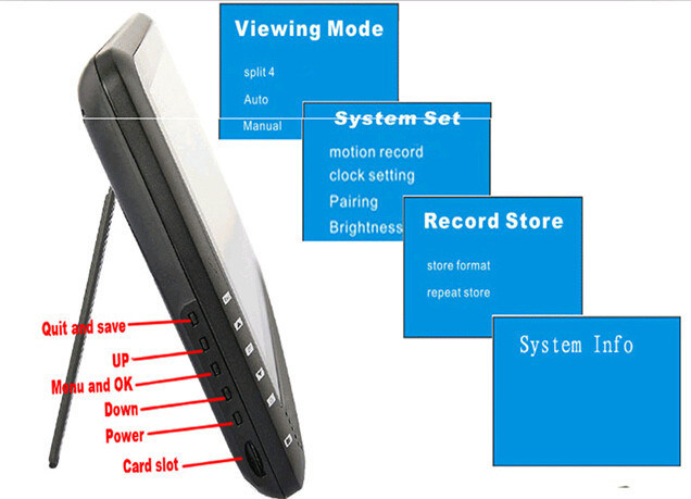 Se você compra 2 câmeras com o monitor como um grupo, às vezes você quer adicionar a câmera extra ao sistema, seja certo comprar a mesma câmera da mesma fábrica, se não não trabalhará. Leia o manual do usuário antes da operação para “emparelhar-se”, quando obtem no menu do emparelhamento, imprensa “que emparelha-se” na tela, entrementes pressione o botão no conector da câmera, você pode ver o vídeo da câmera imediatamente.